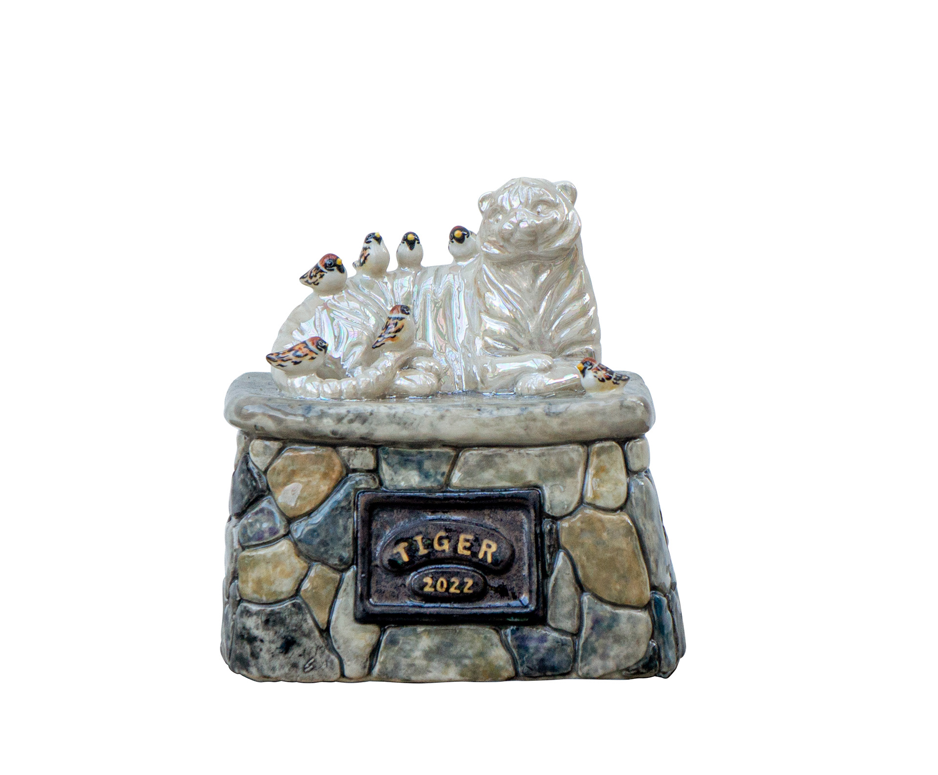 <맹호상과 참새>, 2022. 백토에 채색, 12.5x12x8.5cm.