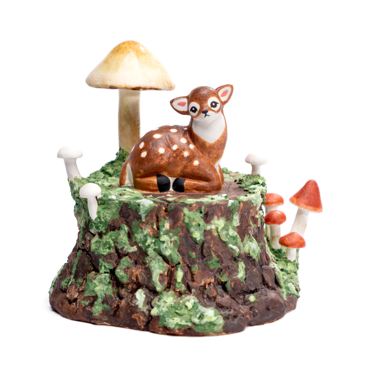 < 나무 위 꽃사슴5>, 2024. 백토에 채색, 9.8x10.5x9.5cm.