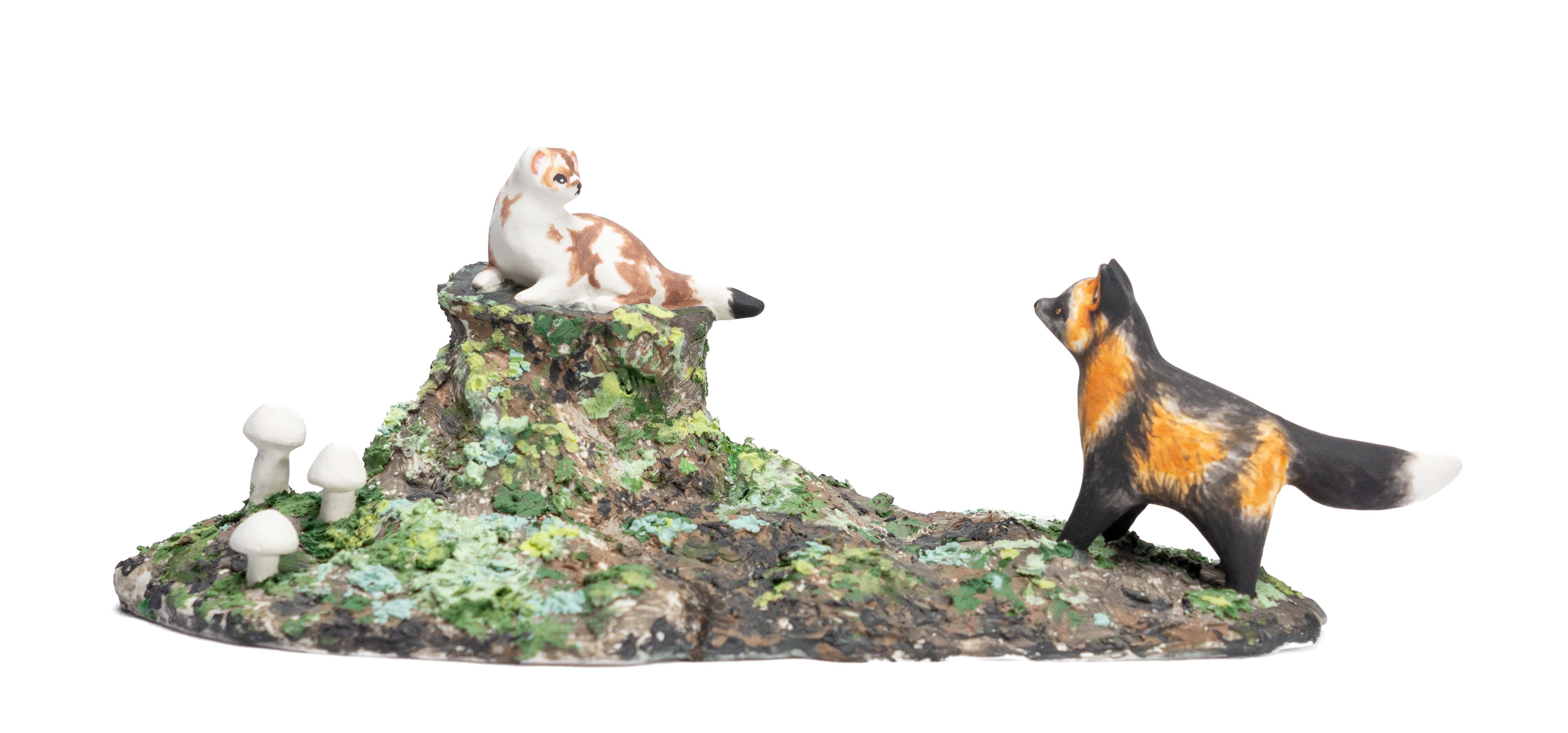 < 족제비와 크로스 여우>, 2024. 백토에 채색, 7.5x21x12cm.